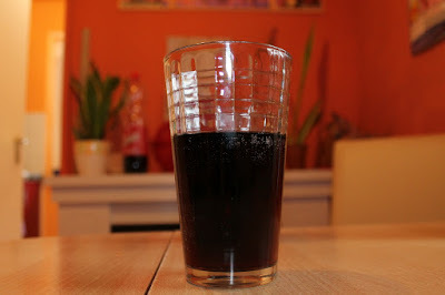 The glass slipped off the plate, and shattered on the floor, causing the sticky black soft drink to run everywhere.