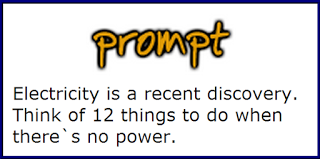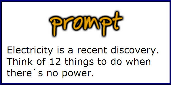 Electricity is a recent discovery. Think of 12 things to do when there's no power.This prompt actually turned out to be very appropriate, because we've had quite a few power failures lately. On Thursday night, our power went off at home, and didn't come back on until early Saturday morning. On Sunday, the power was out for about 10 minutes, and even today at work, it went out at around 15:30 and stayed off for 20 minutes. Eskom is really struggling to keep up with the winter demand, it seems.Anyway, on to the prompt. It's actually not as easy as it sounds, but let me think.... If it's daylight, you could always read a book, so long as you read a print copy, because a tablet or e-reader would require power, and thereby break the rules. If you need a bit of inspiration for what to read, check out My Books!If the weather is warm, how about lounging around outside?Take a swim, if you have a pool, or visit a public pool, or a friend who has one.Take a nice relaxing stroll through nature.How about riding a bike? When last did you do that?It's fun to make a fire (outside, please!) sometimes. Just sit around it and chat, or cook your dinner on it. Either way.Instead of phoning, texting, or hopping on social media, go visit a friend in person. Talk.Go fishing.While you're at the water, skim stones.Speaking of throwing things into the water, if you're near a bridge over a stream, stand in the middle of the bridge and drop leaves or twigs into the water. Run to the other side of the bridge, and see if you can spot them.Write. "But how?" you ask, "There's no computer!" Ah, young grasshopper, what do you think people used before computers were invented? No, I'm not talking about a typewriter. Stop over-complicating, you probably don't have one of those. What I'm sure you do have is a pen or pencil, and some paper. It's an amazingly freeing experience.Finally, when the sun sets, the obvious suggestion springs to mind. If you have a partner, or perhaps even if you don't....I have to tell you, the first four came easy. As did the last one, but I wanted to keep it until last. But the others? I really had to rack my brains! And I'm sure some of these can be construed as duplicates of each other, and you could of course do two or more of them at the same time.So what are your suggestions for things to do when there's no power? I'd love to know; comment and tell me!
