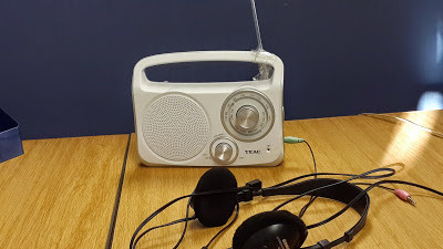 I have a TEAC portable radio on my desk, which I like to listen to while I work. It's quite small, perhaps a ruler's length across, about half as high, and less than ten centimetres thick. On the left hand side of the front is a large circle containing the speaker, which takes up about half of the face. Slightly smaller than the speaker, on the right, is the tuning dial (it's analogue). Near the bottom of the radio, between the speaker and the tuning dial is the combination volume control/power knob. A long metal antenna sticks out of the top, on the right hand side, but it's currently held in place by cello-tape. On the right hand side, along the width, are two jacks, one for my headphones (which I keep permanently plugged in, as I'm in an open-plan office), and an auxiliary out.At the back, on the right hand side, is the figure of eight power jack and the battery casing (although there isn't a battery in it, as I keep it plugged in).And now, let me turn to look at my radio, and see if I described it accurately. What do you think?