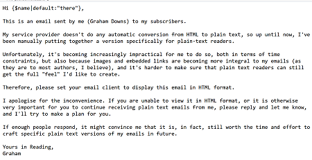 Therefore, from now on, readers who have their email clients set to display emails in Plain Text by default will receive the following text when they open my newsletter: