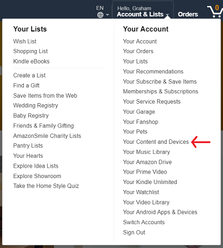 Hover over "Accounts & Lists", on the right-hand side, below your name. This will pop up a menu. Then click "Your Content and Devices":