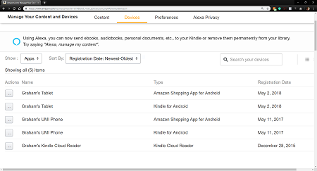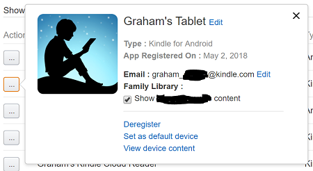 I have a few listed here because I happen to have several apps installed on several different devices. Depending on your setup, you might only have one. Find your Kindle and click on the ellipsis button ("...") to the left of it. This will pop out a panel with all the details of that device: