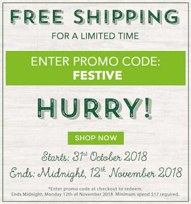 Place an order and spend a minimum of $17 before Midnight, Monday the 12th of November, 2018 (AEST and NZST) with the promotion code FESTIVE, and you will receive free shipping on your order. The promotion code can be used as many times as you, or your family and friends, want on any orders between now and then.