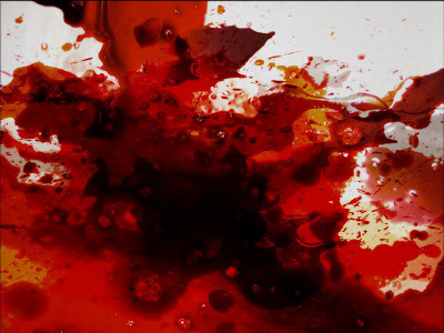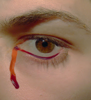 Labbra, guance e mento sono sporchi di sangue; le mani rosse