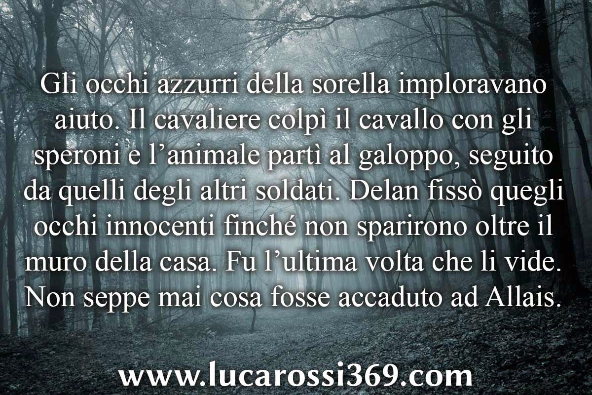 Delan aveva poco più di quindici anni. Giocava con sua sorella Allais nel cortile dietro casa. D’un tratto, udì il fragore di un gran numero di cavalli che si avvicinavano al galoppo. Si guardò intorno freneticamente, alla ricerca di un luogo dove nascondersi, finché non individuò la botola che portava in cantina. Prese sua sorella per mano, corse, aprì le ante e la spinse giù per le scale, seguendola e chiudendosi la botola alle spalle proprio mentre i cavalli entravano nel cortile. I due, terrorizzati, si rintanarono tra le damigiane impolverate, ma dopo pochi minuti la luce del sole illuminò a giorno la cantina. Tre soldati scesero le scale e li scoprirono subito.“Ecco la biondina,” commentò uno di loro, avvicinandosi e afferrando in malo modo la bambina per il polso. Lei si ribellò, ma il soldato reagì colpendola così duramente al volto da farla sanguinare.“Ehi,” lo ammonì il compagno, “ha detto con le buone!”Delan si avventò sul soldato che aveva preso la sorella, ma gli altri due lo bloccarono e lo trascinarono su verso la botola.Il ragazzo vide Allais venire caricata sulla groppa di un cavallo come un sacco di patate.“E di lui che ne facciamo?” chiese il soldato alla sua destra.Un cavaliere alzò le spalle. Lo lasciarono andare.Gli occhi azzurri della sorella imploravano aiuto. Il cavaliere colpì il cavallo con gli speroni e l’animale partì al galoppo, seguito da quelli degli altri soldati. Delan fissò quegli occhi innocenti finché non sparirono oltre il muro della casa. Fu l’ultima volta che li vide. Non seppe mai cosa fosse accaduto ad Allais.