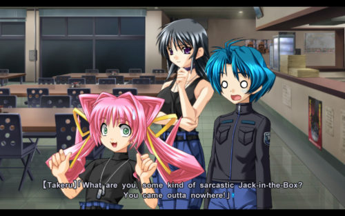 Now, when I began the game, my first thought was that Takeru was a jerk. But I can deal with a jerk protagonist who gets better, and Takeru did grow on me (if nothing else, through sympathy as Meiya and her cohorts turn his life upside down).