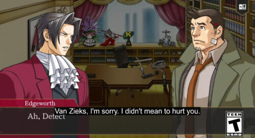 In the first video, a caption immediately displays that says, “Van Zieks, you are the only one who knows the truth about this case.” In the second, around 4 seconds in when the dialogue starts, the caption reads, “Van Zieks, I’m sorry. I didn’t mean to hurt you.”