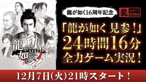 December 8, 2021 is the 16th anniversary of the Yakuza series, and to celebrate, RGG Studio will be live streaming Ryu ga Gotoku Kenzan.