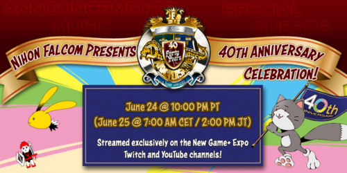 Well, this is another 40th anniversary celebration being held in connection with New Game+ Expo, which revealed that it will include “performances by Falcom jdk BAND, a message from president Toshihiro Kondo, and special announcements.”