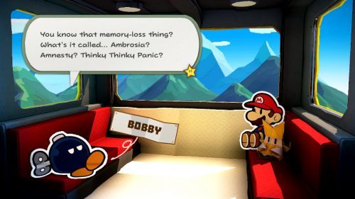 About a minute and a half into the trailer, it gets into the question of Origami King’s partners. After Olivia, who appears to be the primary partner a la Tippi/Kersti/Huey, it introduces some others. The Bob-omb, who had everyone curious due to him appearing in multiple environments yet not having a name, is revealed to have amnesia. I suppose that’s why he introduces himself as Bob-omb. The trailer calls him Bobby.