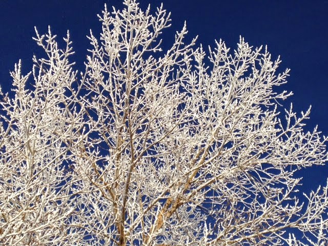 A little before Christmas we had the unusual combination (for Wyoming) of moisture in the air and cold temperatures for a couple of days in a row. The ice that formed as a result made the world look like a Fairytale. Or Jotunheim. Anyway, I had recess duty the morning it started warming up. The ice was falling from the trees and glittering in the air, and the sky, in contrast with the ice, was an awesome, shocking blue. It was an absolutely fantastic morning, and those pictures were the first thing I thought of when Veronica announced her challenge of Aqua, because the sky that day matched the beach glass she used in her picture.