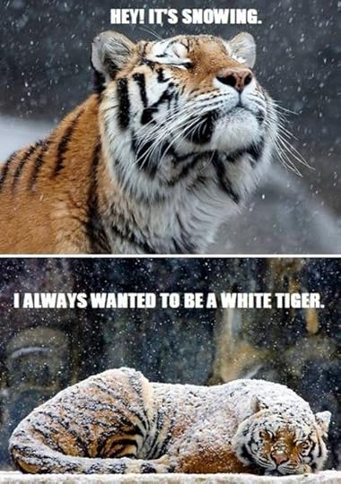 Not really funny, but certainly cute, and I love the tiger's face in the top photo. When it snows and the wind isn't blowing, sometimes I'll lift my face to feel the snowflakes melt on my skin, and I feel like the tiger looks.