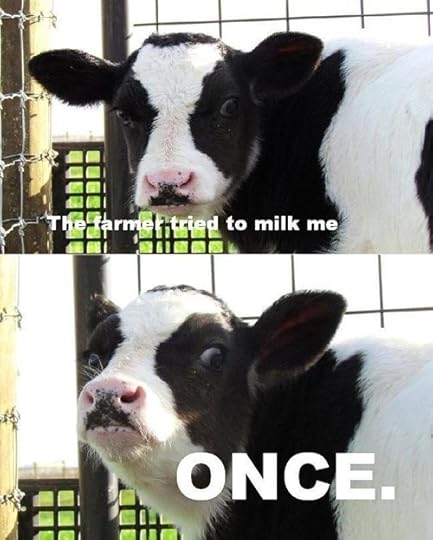 I'm conflicted between the cow and the cat with the bearded dragon. I think I'll go with the cow, because they can be kind of scary, actually. The threat in the calf's eyes is probably very real!