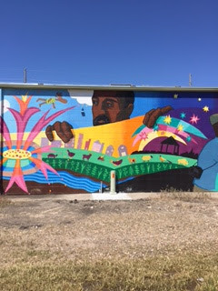 This is one panel of a connected row of buildings whose rear exteriors are painted in a colorful mural along the bike path. I liked this one because of the flying moose. Just joking. I'm actually quite perplexed at the flying moose. It's not like there are moose in Nebraska. In any case, all the panels are whimsical and bright. Very interesting to look at, and I imagine have meaning to the area.