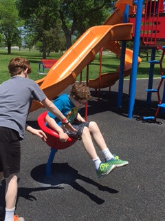 And then finally we ended up at a different park than the morning. Actually, by taking the bike path in a big (10-12 mile) circle, we managed to go through the three major parks in town. This one has new equipment, old equipment and a spray park. We enjoyed all three, proving once again that playgrounds aren't just for children, they're for the young at heart.