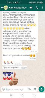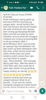 klik di sini untuk pembelian“ASSALAMUALAIKUM Nunu, apa khabar bakal pengantin?” Suara ceria Tisya kedengaran di hujung sana. Nufah terdiam. Dia tersenyum pahit. ‘Bakal pengantin tak jadi,’ bisik hati kecilnya.