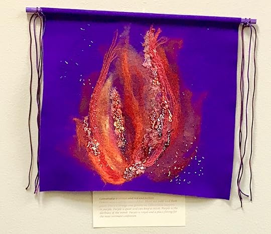 About this piece, the artist writes: Conversatio sparked the desire to turn around, to turn, to turn around, to turn, to return, to turn and turn again. So, while it starts out small, it could eventually become a consuming fire that doesn’t burn but sets one clearly in the heart of God – more and more as one turns. There have been times when I have turned away from God. I didn’t want any part of God. I believed God wasn’t fair, wasn’t as loving as everyone said. Then, there were times I just wanted to do what I wanted to do. It was that spark, that little fire that never went out that kept luring me back, luring me to turn to God again . . . Conversatio is orange and red and fuchsia. Conversatio is all the colors of fire. There are golds and dark plum. There is orange and goldenrod. But Conversatio happens in purple. Purple is quiet and can keep a secret. Purple is the darkness of the womb. Purple is royal and a place fitting for the most intimate confession.