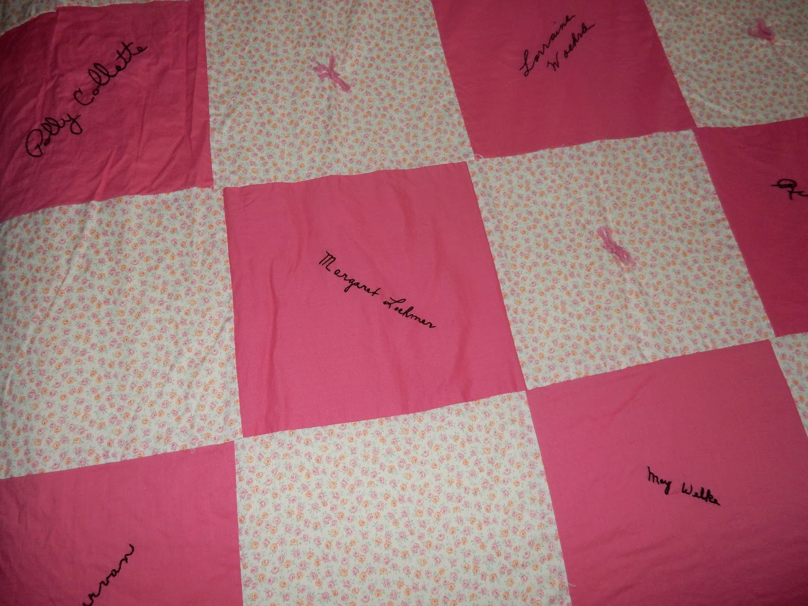 It’s called a signature quilt. Each of the pink squares has the embroidered signature of each of the ladies in my mom’s homemakers group from the 1950s. My mom never got her quilt put together, I believe many years ago, she gave her squares to my oldest sister. This particular quilt was given to Mom in 2010 when one of the ladies passed away. Her son gave it to Mom as he hadn’t known any of the women and only had sons of his own to pass it down to. I believe that there may be only one or two of these sweet ladies still alive. A few of them, I don’t remember at all. But I still cherish all of their signatures.