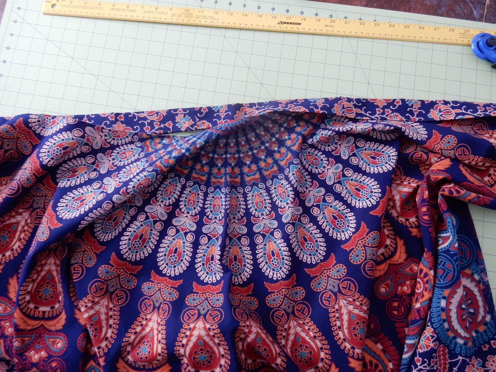 I knew I wanted to make a wrap skirt out of half of the material. Don’t know what I’ll do with the other half yet – this piece of material was that big. Of course, I forgot to get a picture of it until after I had started cutting it apart.