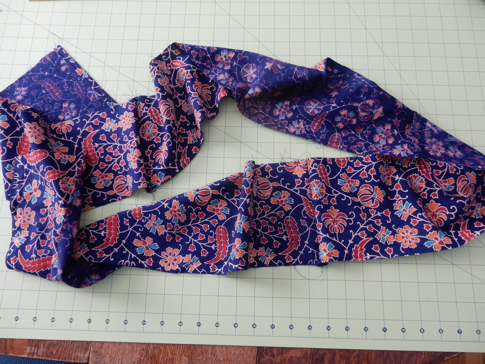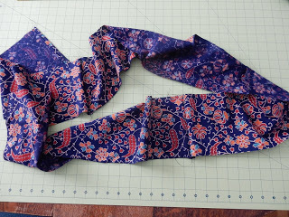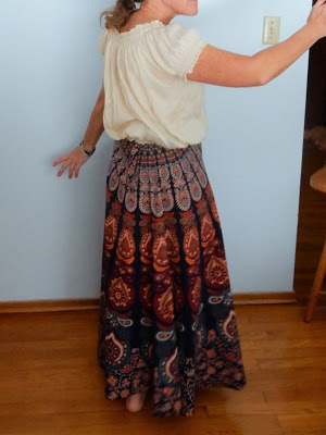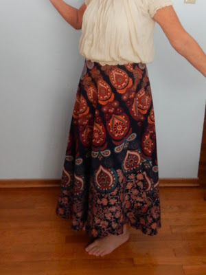 Also, in case you are wondering, I did look up patterns for wrap skirts on-line, but they all seemed too complicated. I know, right? How can a wrap skirt be complicated? So I just laid my old wrap skirt on top of this piece of fabric, cut it out, sewed the sides and hem and added the waist band with tie.
