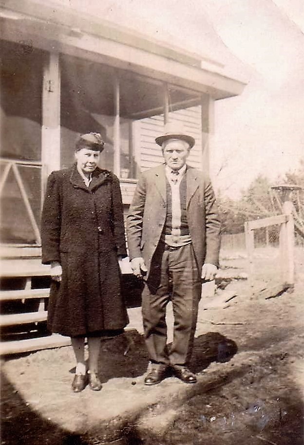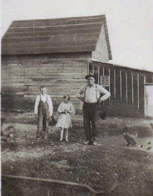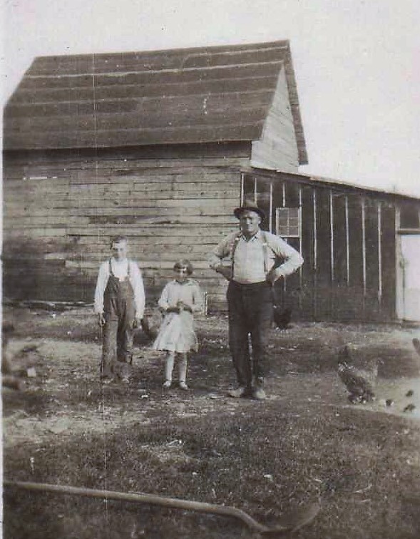 Grandpa with my Uncle Robert and Aunt Helen, in front of their first barn, around 1929
