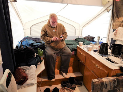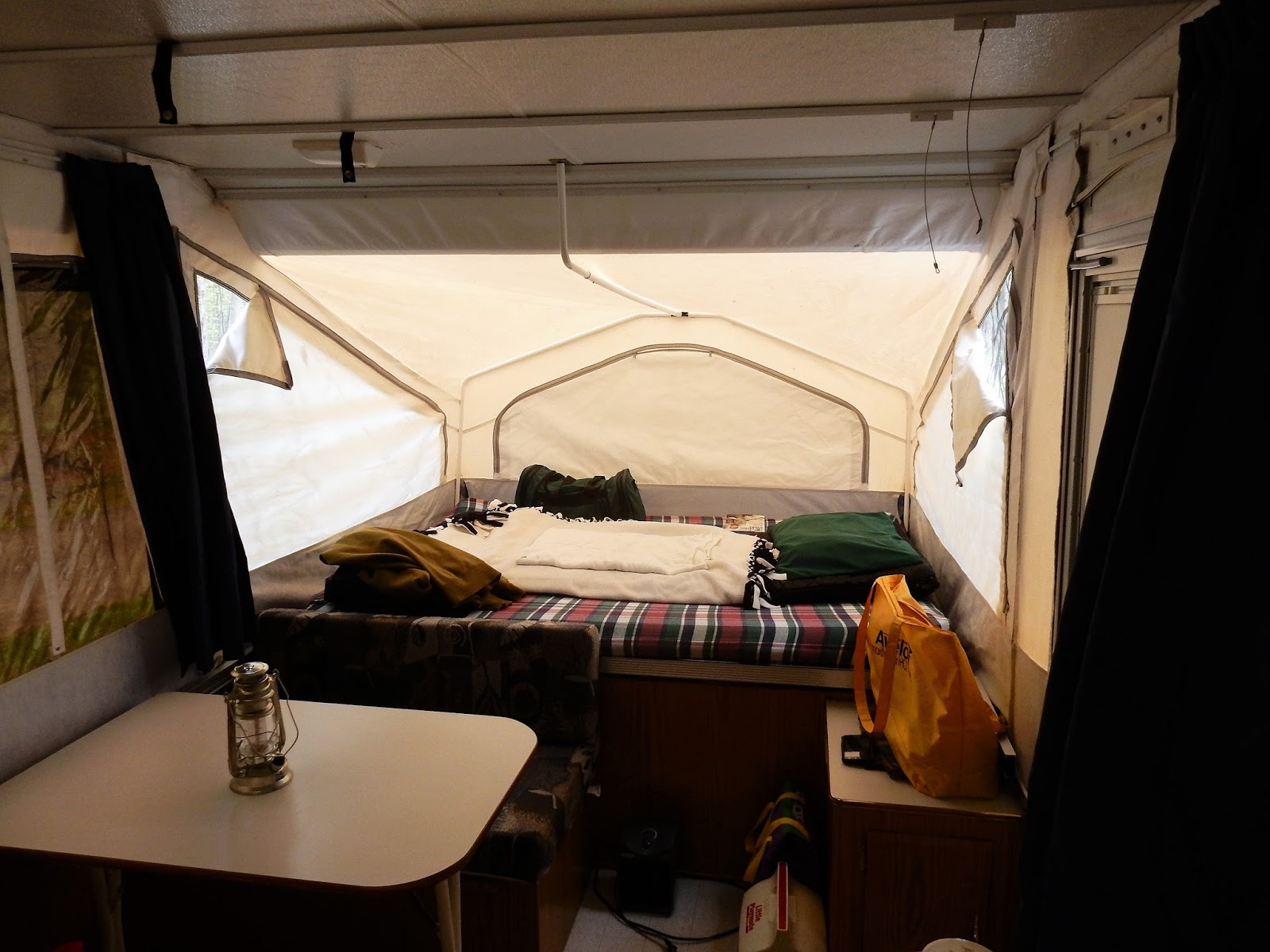 Hubby’s side. Ok, this was after spending a night and a day here, but my side was still as neat as when I set it up.