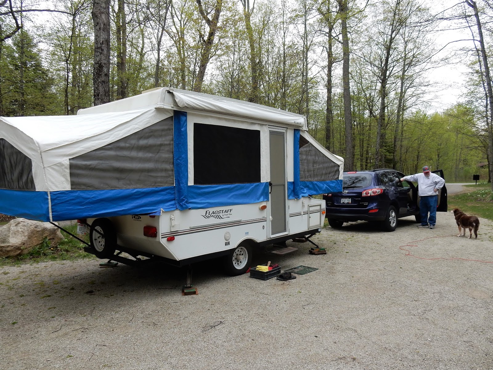 We stayed at Bewabic State Park, just west of Crystal Falls Michigan. My sister Pat and I had camped there a few times in the early 1980s. At that time, we mostly wanted a site which was private and level for our tent. Now, with the popup camper, we need a larger site which is easy to get in to. Can’t get much easier than a site you can drive through. I think I could even park here by myself, but Hubby has serious doubts about that.