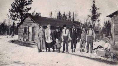 My mom’s parents worked together at a logging camp in the Northwoods – he as a logger, she as a cook. I could be wrong but I think that Grandma is the second woman from the left and Grandpa is next to her. According to the back of the photo, the little boy is their son, my Uncle Robert. If that is the case, the picture had to be taken around 1918.