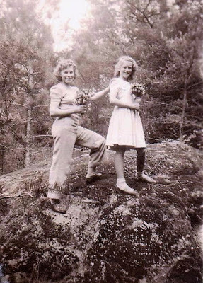 I love this picture. The favorite that I have found so far. Mom and her friend Marion Paul, sometime in the early 1940s, on the Big Rock in the woods behind the house where I grew up.