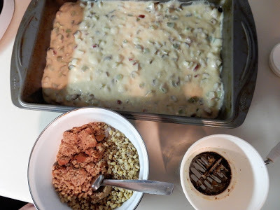 Rhubarb Cake1/3 cup shortening1 cup sugar1 egg¾ cup milk1 2/3 cup flourSalt 1 tsp soda2 cups raw rhubarbMix as for cake. Put in 9 x 12 panTopping½ cup white sugar½ cup brown sugarCinnamon½ cup chopped nutsPat on topping. Bake 350 for 40 minutes
