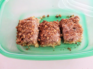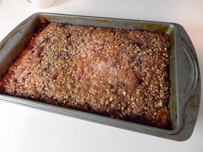For those of you who want exact measures, I use ½ teaspoon salt. Mom had an old yellow coffee cup with a broken handle that she kept on her stove filled with salt. Whenever she was cooking or baking, she’d dip a kitchen spoon in the salt and add a random amount to whatever she was making. It always worked. And the cinnamon? At least a teaspoon, coz you can’t have too much cinnamon. Also, the pan needs to be greased. I also cut back on the brown and white sugar in the topping to a third cup. It’s good with more, but messy coz it’s too thick to bake into the cake.