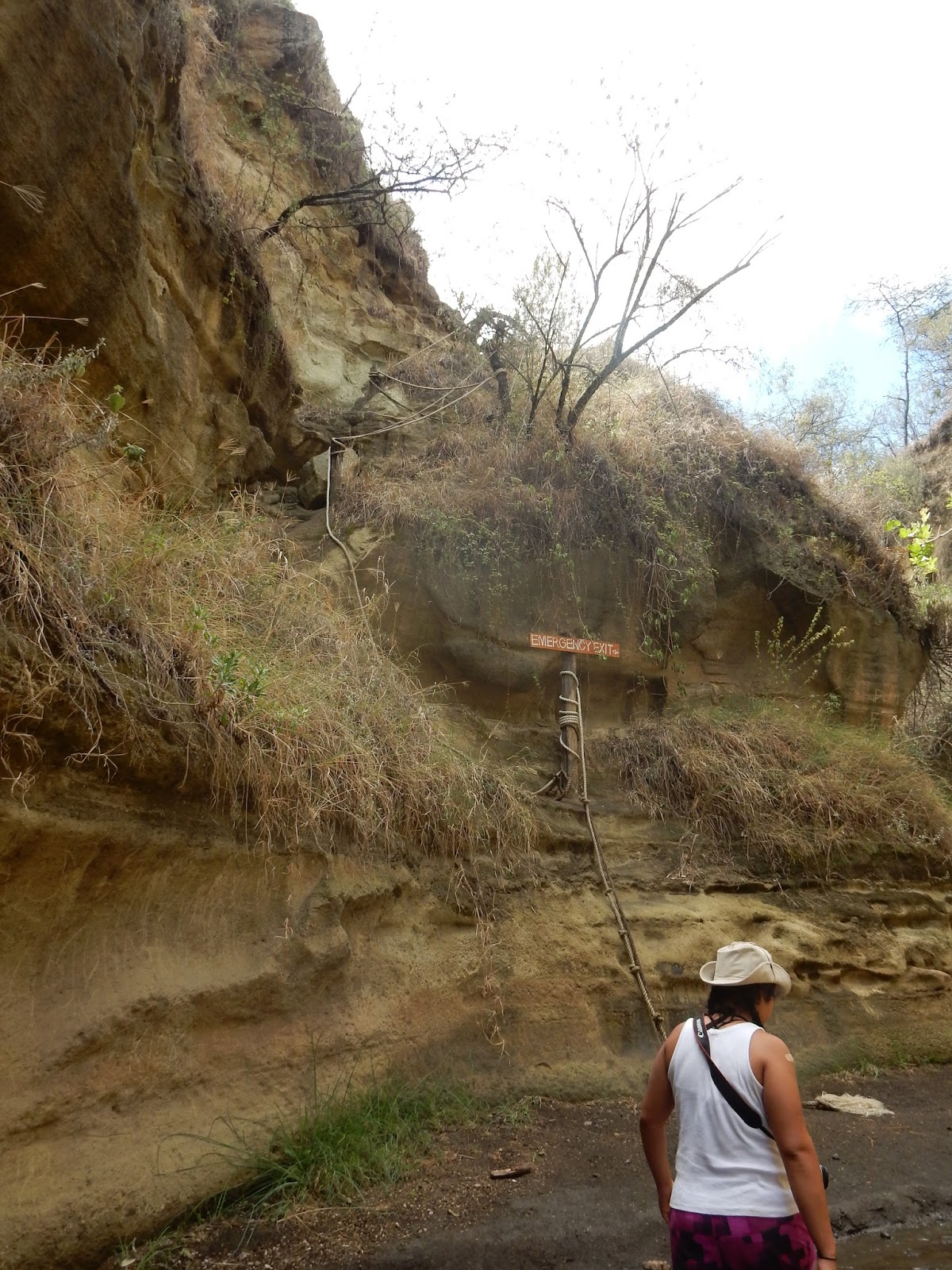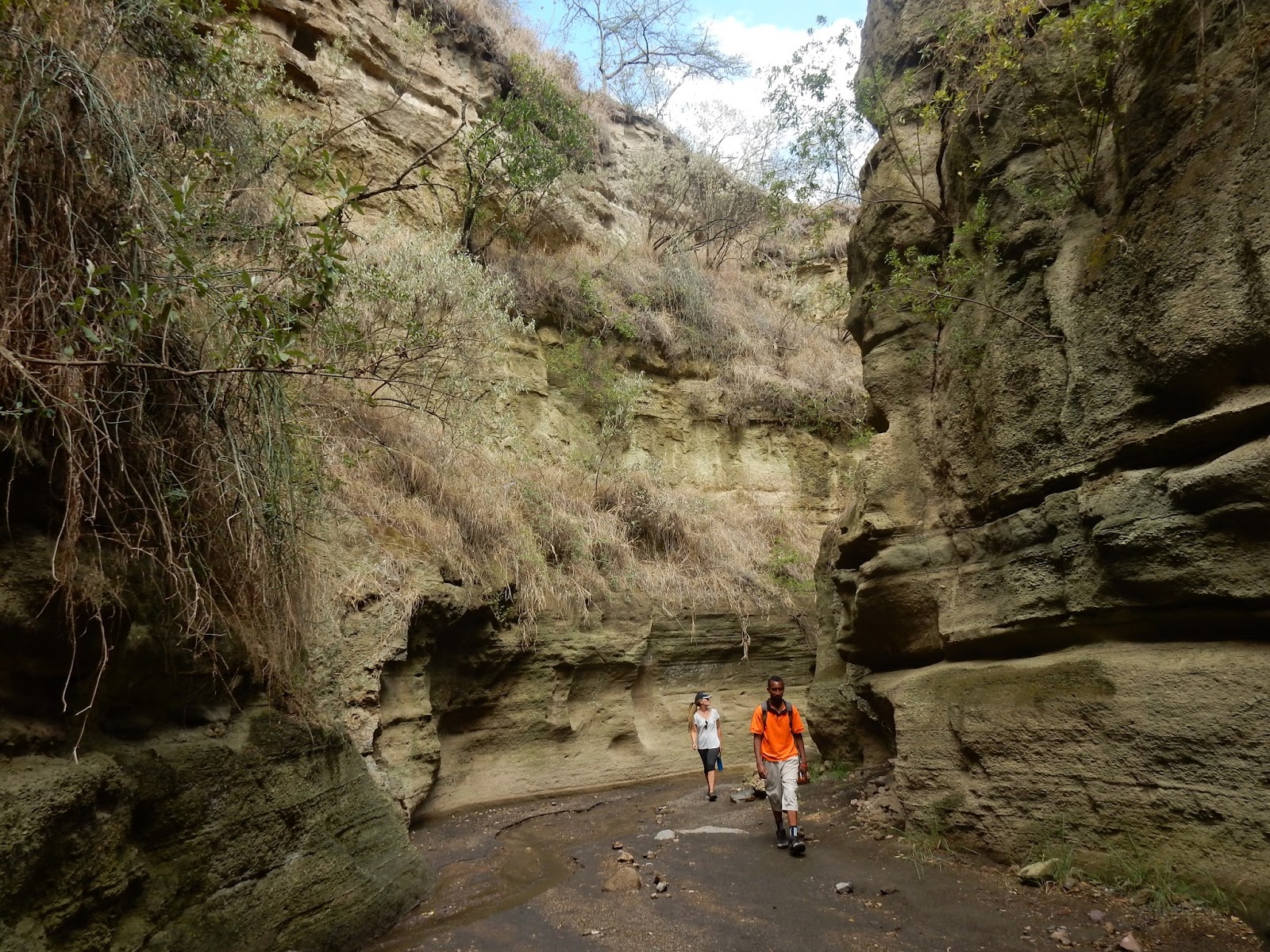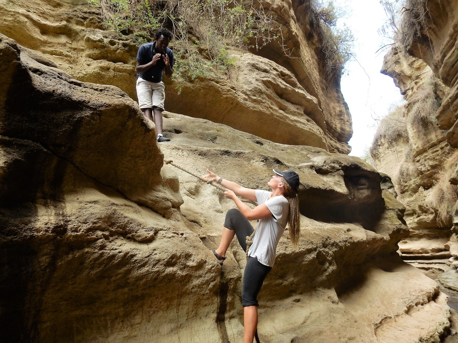 We were at Hell’s Gate National Park in Kenya last month, hiking through this beautiful gorge. We got to what looks like a dead-end, and I’m thinking, yikes, we have to hike all the way back out.