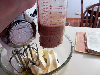 Blend these first ingredients together. I usually blend together the margarine and peanut butter first, with the margarine warmish so they meld together well. I also use this great Pampered Chef Measure-all cup to measure the peanut butter. Anybody else have a better idea for measuring it and then getting it all out of the measuring cup?