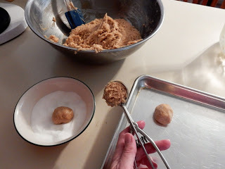 Shape dough into balls. I scoop out the dough with the medium scoop from Pampered Chef – no I’m not a secret consultant. These are the only Pampered Chef products I regularly use, besides, of course, my stoneware.