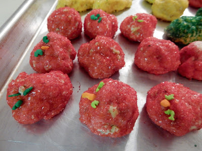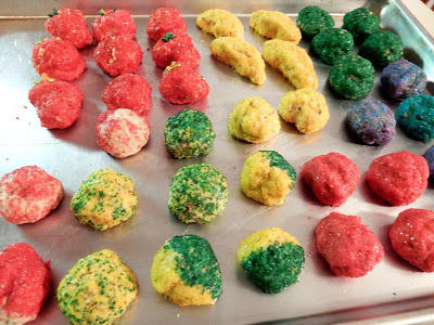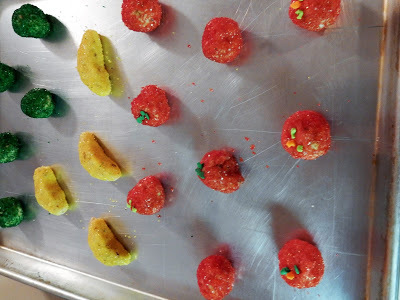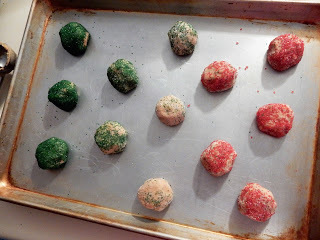 Roll the dough balls in sugar. I, along with the rest of world, generally roll them in white sugar, but I thought I’d try green and red sugar this year to make them more festive.