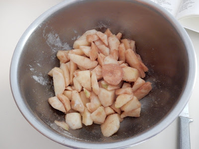 Peel and slice 5 apples. Mix with 1 tsp cinnamon and a couple tablespoons of sugar.