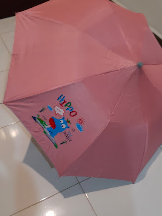 Ikept wandering and found some kids’ umbrellas in several different colors. WhenI asked the woman to see them, she just opened the pink one which would not bethe one I would pick. But when I saw it, I fell in love. It had an adorablehippo in the jungle on it, and for six US dollars I couldn’t pass it up.