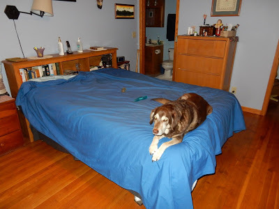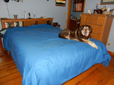Dino on the new bed looking all happy again. And one more of his momma's worries put to rest as Dino can jump the few extra inches up to the new mattress.