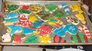 Mom would frost them, always and only with white butter frosting. Then my sister Pat and I would trade off sprinkling them with the proper colored sugar, green for trees, red for poinsettias, yellow for bells. Whoever was not sugaring, would put on the accessories. A few mulitcolored sprinkles on the trees, three (no more, no less) silver non-pareils in the center of the poinsettias, two red cinnamon beads for berries on the holly. They were all beautiful - and all exactly the same. It never even crossed our young minds to be creative and try something new. We were too afraid of throwing Mom off. (I think she was menopausal my entire childhood.)