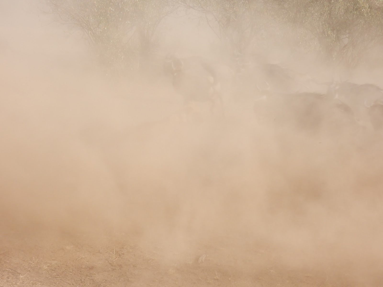 Chaos ensued and the wildebeest turned from the river and galloped back into the plain, stirring up a cloud of dust. Above the fray, bleating could be heard.