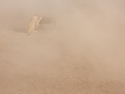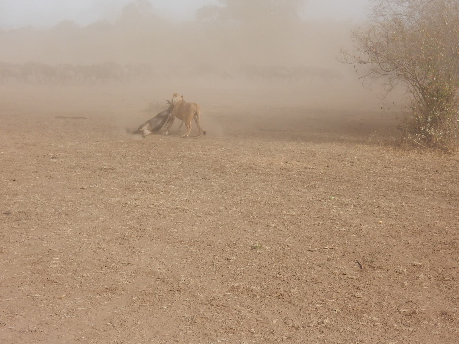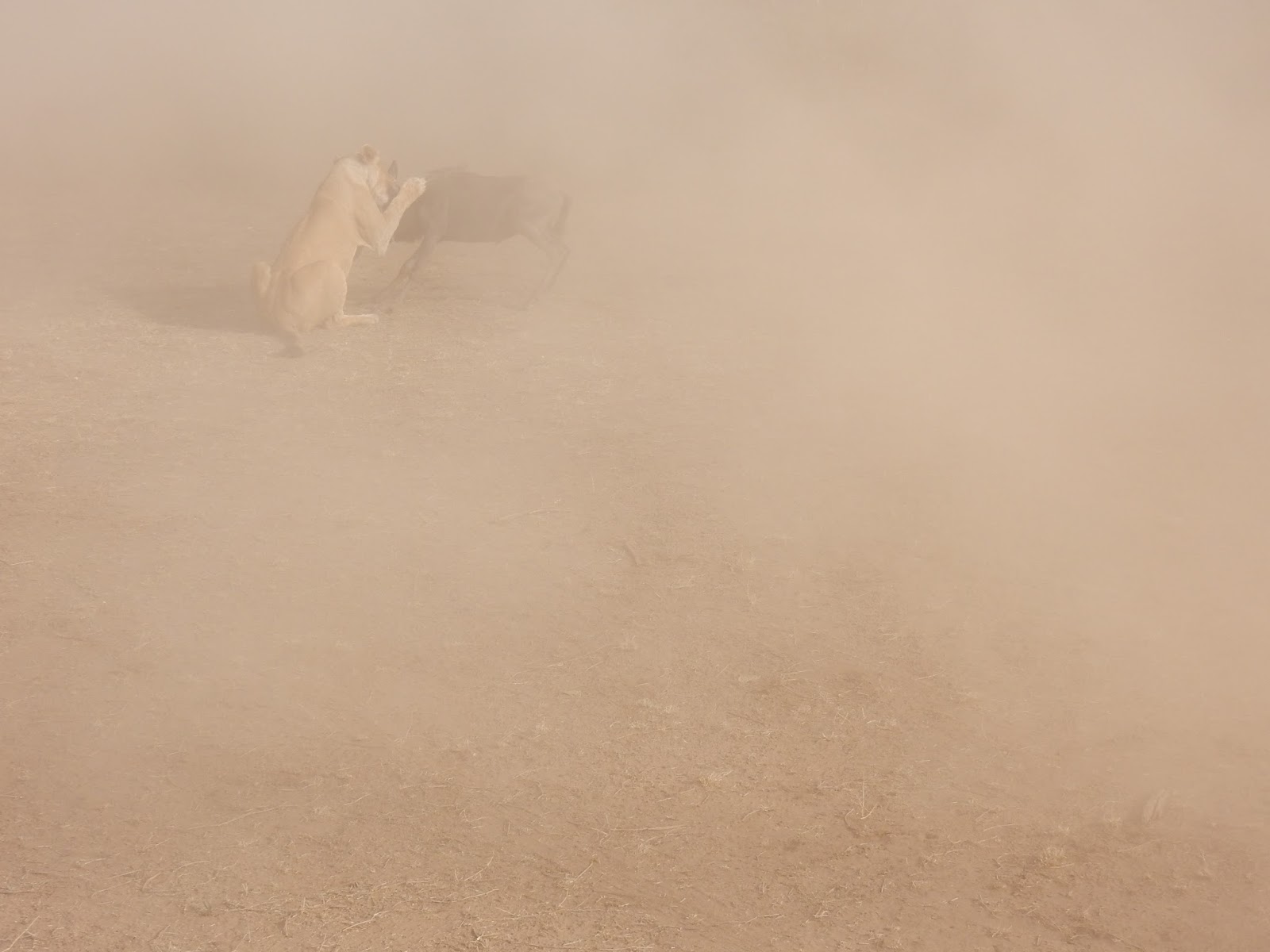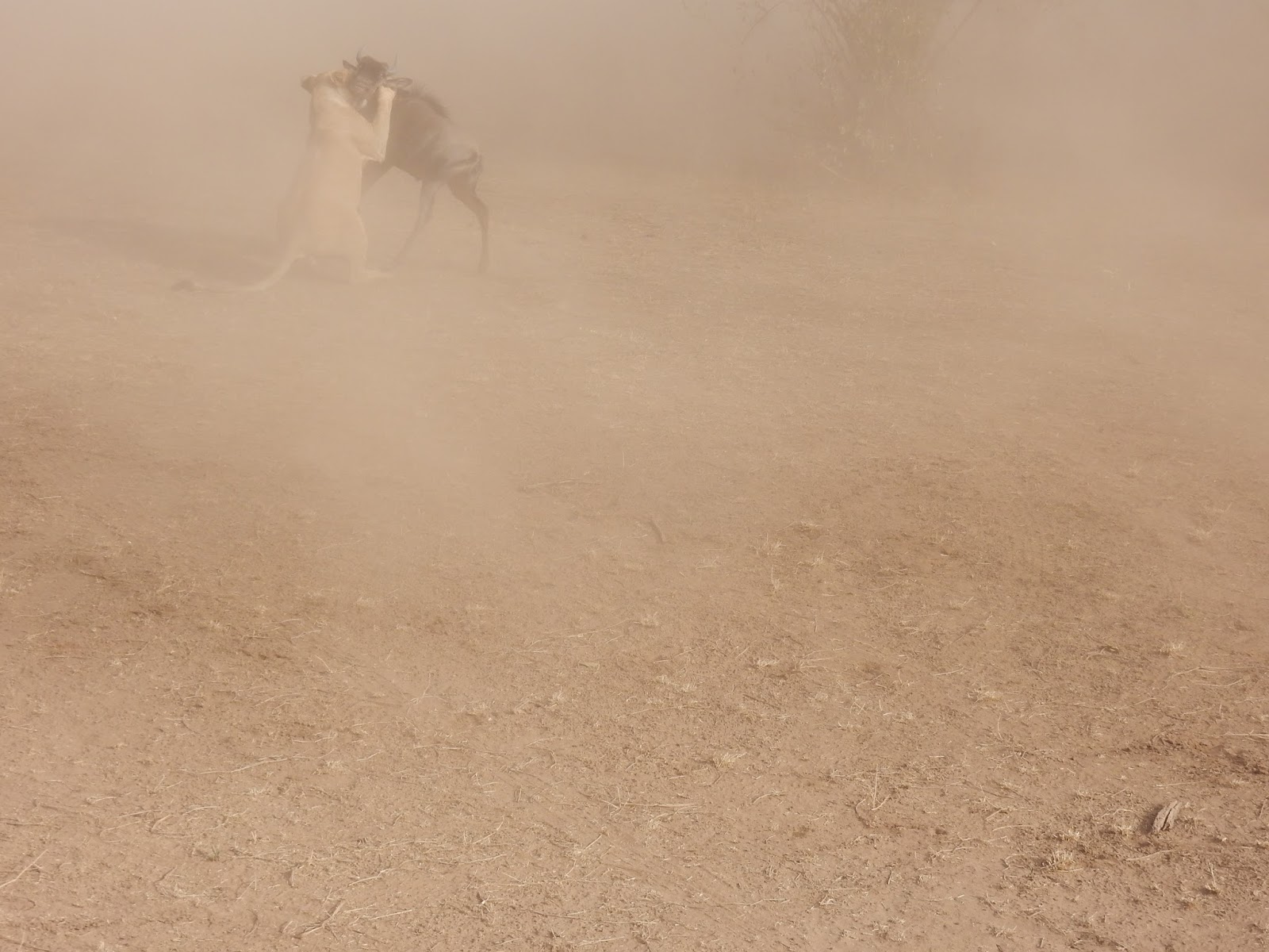 As the dust settled, a figure emerged – the lioness with a small wildebeest by the throat. She hung on, strangling the life from the young animal.