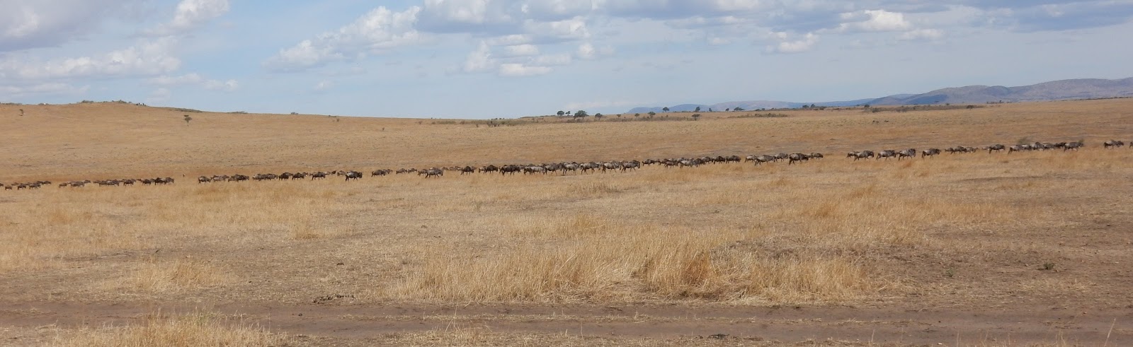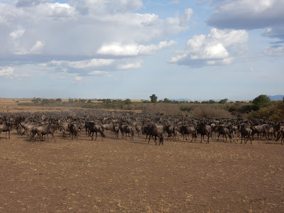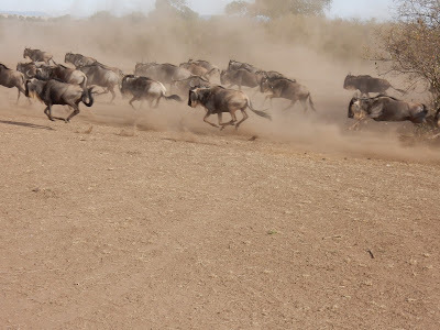 We headed back across the plain and over a rise in the endless landscape. The two safari vans came to an abrupt halt by the scene before us. Tens of thousands of wildebeest stretched before us in both directions, an endless line of the mangy animals, heading towards the river to return to better grazing on the other side.