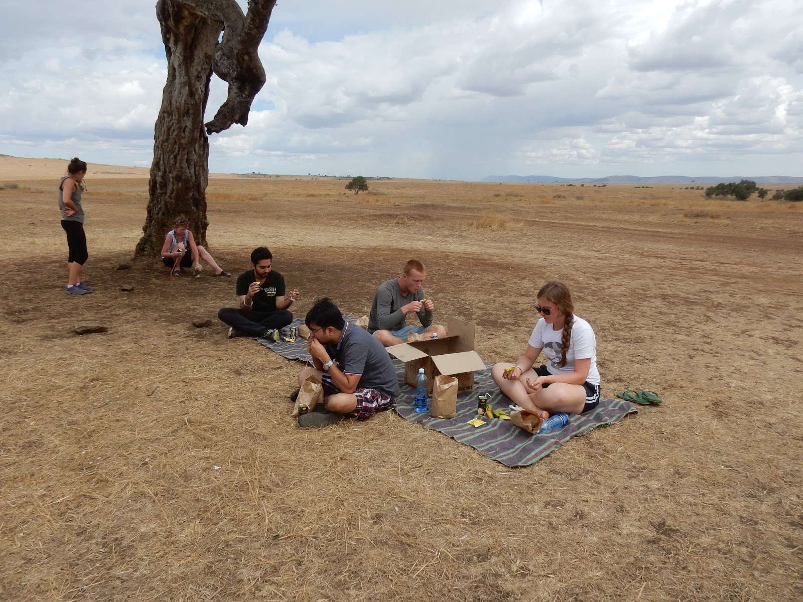 After seeing a plethora of animals that morning, we parked under a tree and our guides – Tony, Izzo and Boni – spread a blanket on the ground and pulled our bag lunches from the back of one of the vans. I didn’t think it would be much of a lunch, but holy cow – a piece of chicken, a ham sandwich, a banana, bag of nuts, and juice box. I thought that was pretty good.