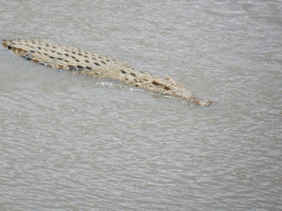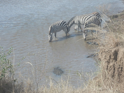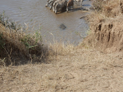 At the river, a small mixed herd of zebra and wildebeest were hovering on the top of the bank. A group of zebra on the other side were calling to their family. A few zebras would head down the bank, but come right back up. Pretty soon a croc was lurking in the water, which of course really spooked the zebras.