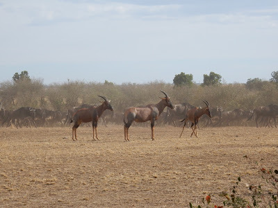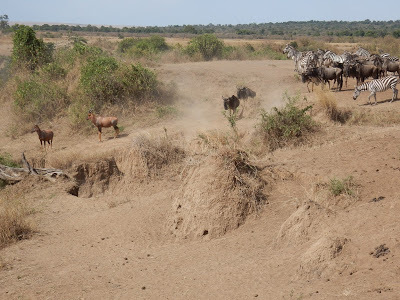 Finally he decided it was time, there was only one place that the herd would cross now. Tony and Izzo turned over the engines and we began bouncing back to the river. The wildebeest had stepped up their pace from a walk to a slow canter in anticipation of reaching the Serengeti with its wealth of grass on the other side of the Mara River. The three silly topis who were too afraid to cross the river earlier had joined them.