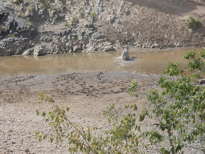 One zebra jumped in and swam half-way across to the sandbar in the middle of the river. His relatives higher up on the bank sent him encouraging brays. He was torn between plunging on and returning to the rest of the herd he had just left, the part of the herd being studied by the croc.