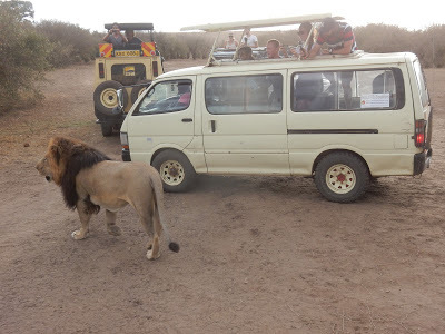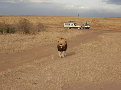 She rose and walked back across the plain. In the direction she was heading, a huge handsome male strutted towards her. Our safari van was in his direct path, but he treated it as though it were a rock that had always been there.