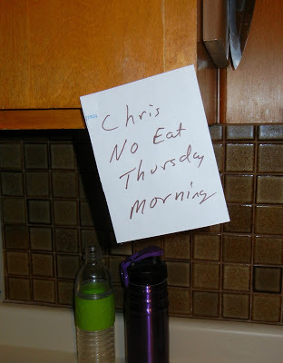 One day last week I had to go to the lab for my routine fasting blood work. Because I sometimes think I would leave my head somewhere if it weren’t attached, I stuck this note up on the cupboard where I keep my cereal bowl. I could so see myself getting halfway through my morning Cheerios before I remembered that I was supposed to fast for twelve hours.