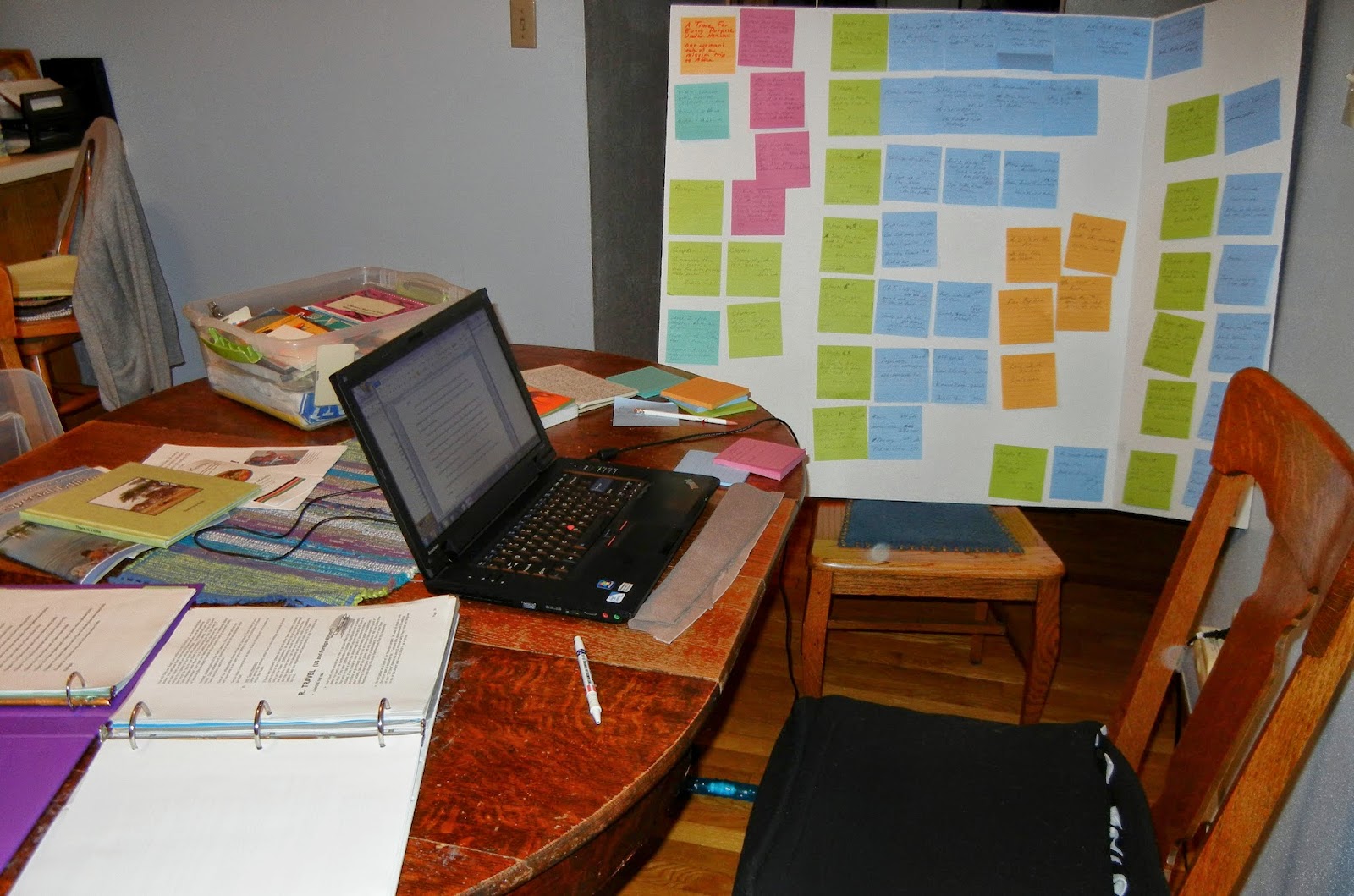 (My writing space when I am on a roll. It has been a while since that has happened, but I will get it back again this month!)