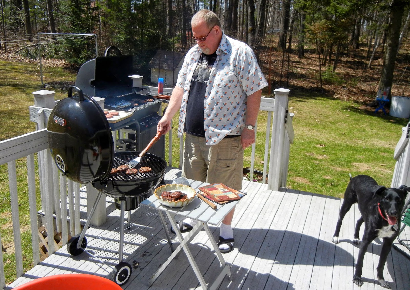 The hubby started up the grills early and got to work on our burgers, brats and wieners. The grand-puppy was waiting patiently for a hand-out.
